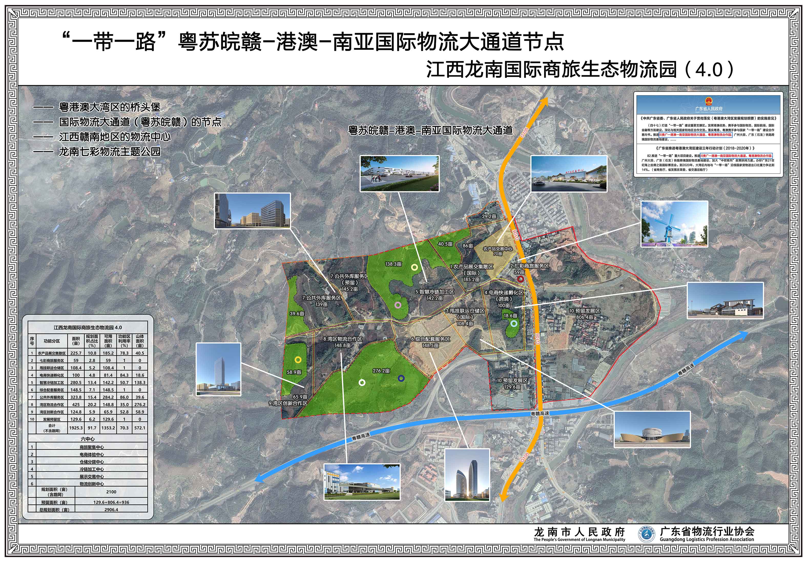 项目概况:龙南国际商旅生态物流园区面向粤港澳大湾区市场,以三南地区资源和引入大湾区资源形成区域物流枢纽,规划面积2100亩。