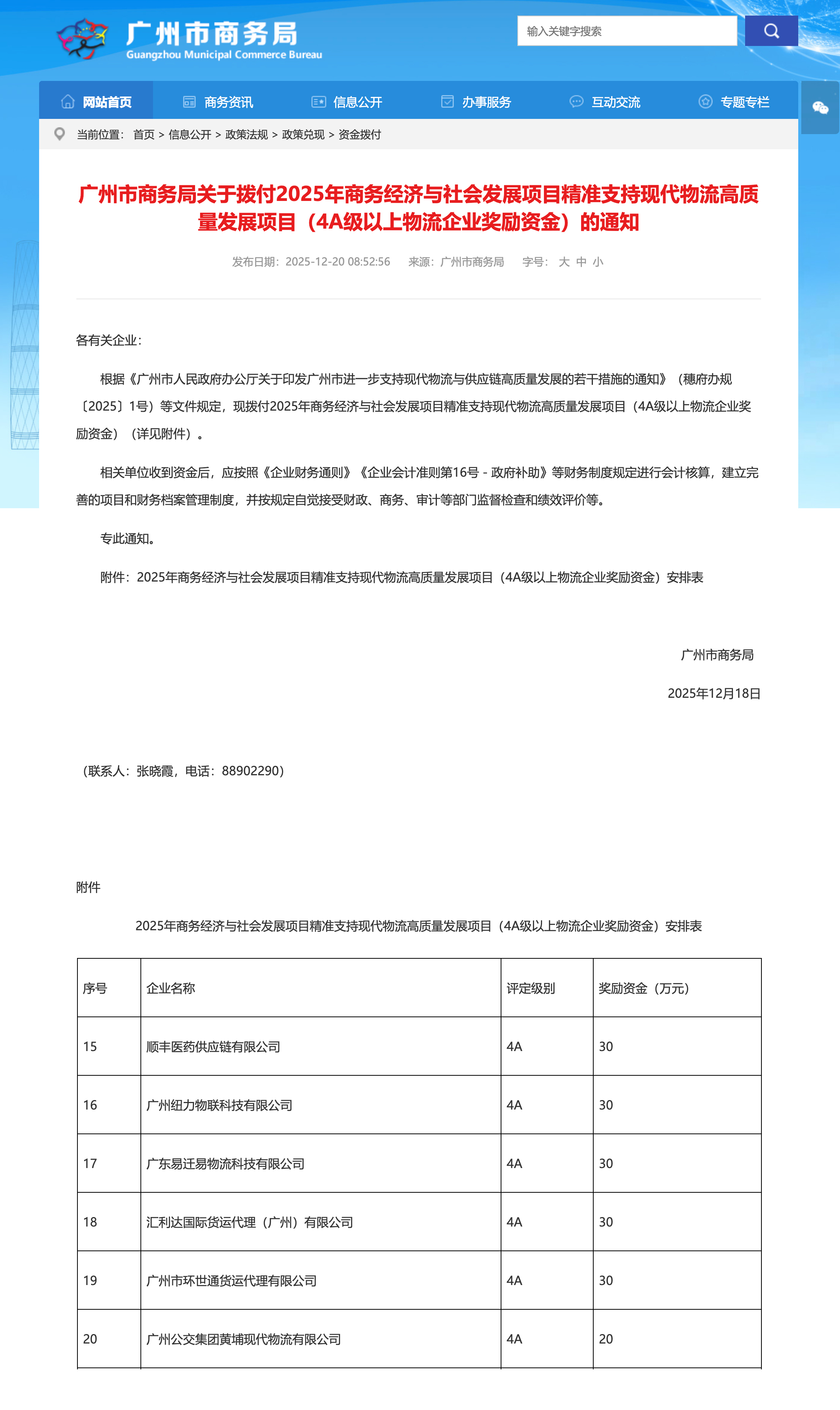 近日,广州市商务局根据《广州市人民政府办公厅关于印发广州市进一步支持现代物流与供应链高质量发展的若干措施的通知》(穗府办规〔2025〕1号)等文件规定,正式发布了获得2025年“商务经济与社会发展项目精准支持现代物流高质量发展项目(4A级以上物流企业)”奖励资金名单。